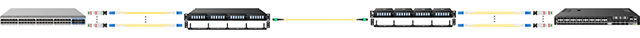 Universal polarity MTP® cassettes with 8, 12, or 24 fibers are widely used for managing fiber cables in data centers or enterprise cabling. Fiber-Life introduced universal polarity MTP®/MPO cassettes with 8, 12, or 24 fibers to simplify duplex fiber polarity management for technicians. The following two examples demonstrate a 25G to 25G connection and a 40G to 10G breakout application using Fiber-Life MTP®/MPO universal polarity optical cassettes.